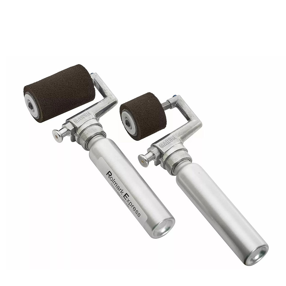 The Rolmark Express all metal, disposable ink cartridge becomes the strong, durable handle once it is screwed on the spindle roller assembly. It utilizes the same 3” neoprene roll that is used with standard fountain rollers.