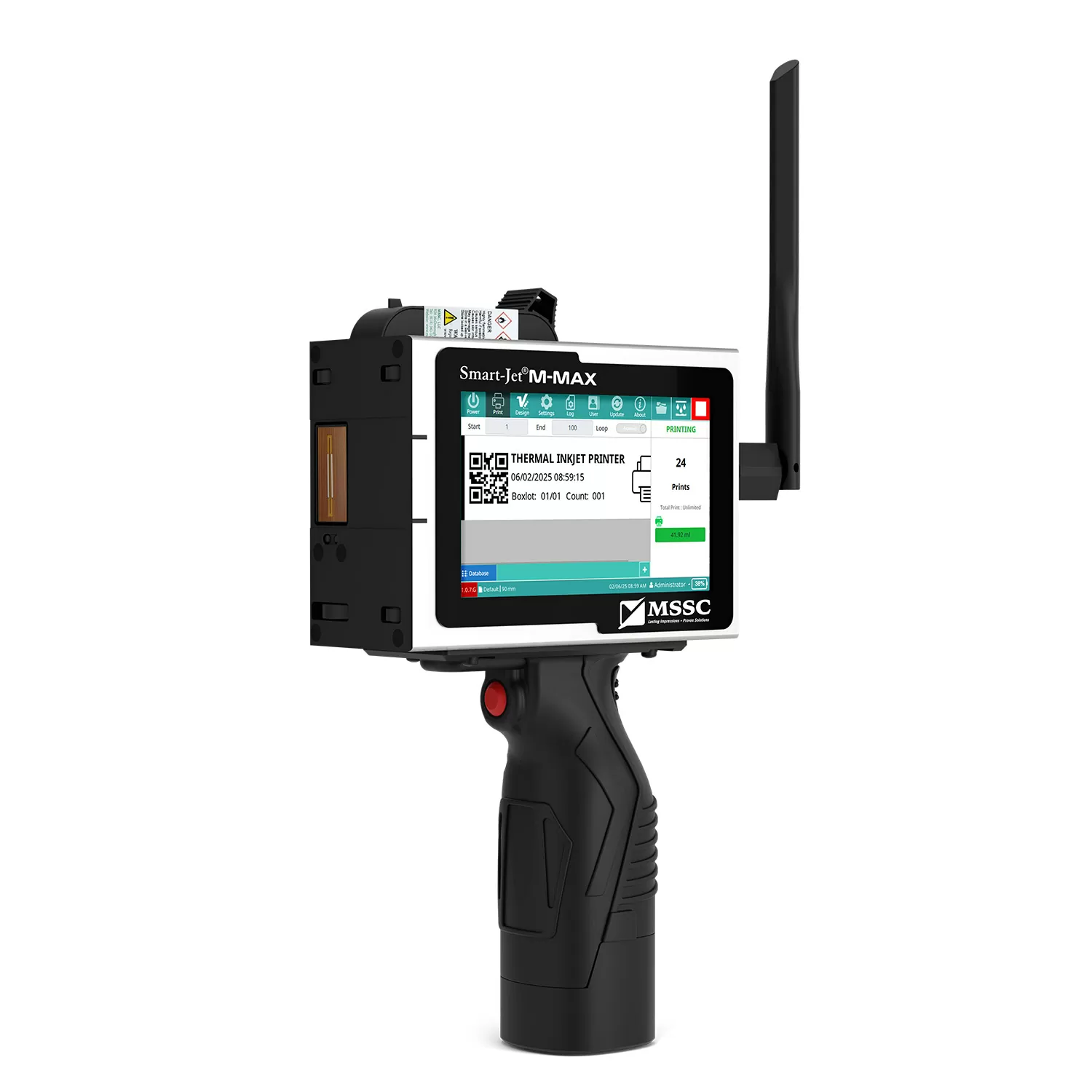 The M-MAX HANDHELD is a lightweight handheld printer that provides up to 1 in./25.4 mm tall print. Weighing just 2.12 pounds/962 g with the battery installed, the M-MAX HANDHELD lets you print anywhere at any angle, on porous and non-porous surfaces, with a range of water-based and solvent-based TIJ cartridge-based inks. Create messages using web-based software (www.tijfreedesign.com) for quick, easy download to printer. Message design software enables free design, no limit on number of lines per message or vertical positioning.